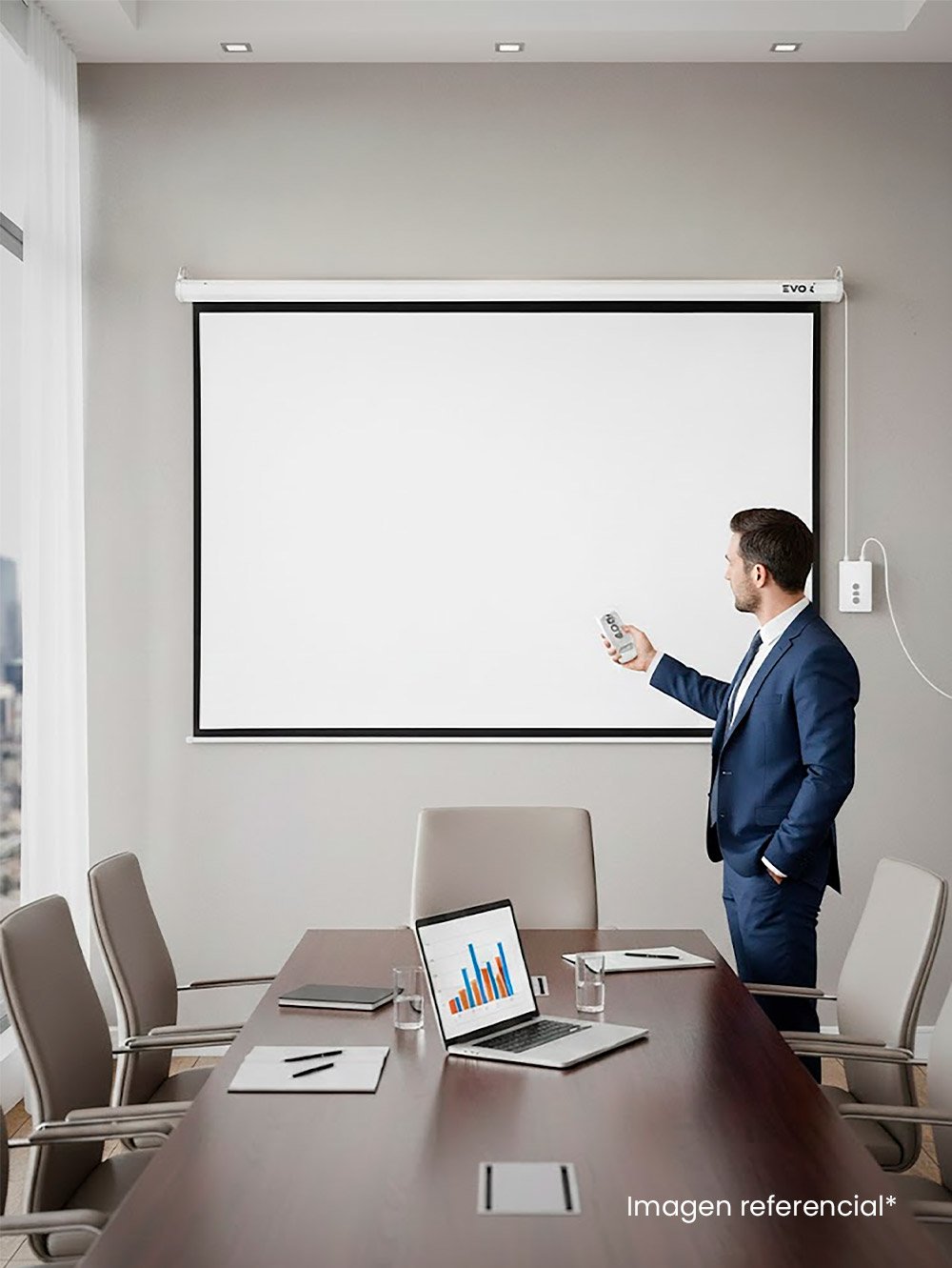 El Ecran Eléctrico Retráctil Evox de 100 pulgadas está diseñado para ofrecer una experiencia de proyección amplia, cómoda y de nivel profesional, ideal para salas de reuniones, aulas, auditorios y espacios de entretenimiento en casa. Su sistema motorizado brinda un manejo práctico y elegante, permitiendo desplegar y recoger la pantalla con total facilidad.