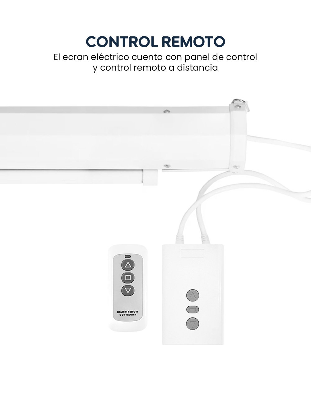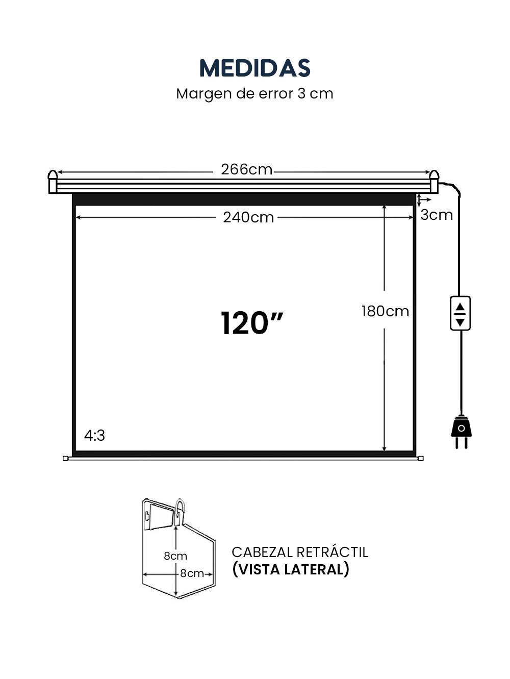 Con un formato 4:3 y un imponente tamaño de 120 pulgadas, ofrece un área de visualización de 240 cm de ancho por 180 cm de alto, ideal para presentaciones de gran impacto visual. Los bordes negros de 3 cm mejoran el encuadre de la imagen y elevan la percepción de profundidad y contraste. Además, incluye panel de control integrado y control remoto a distancia, brindando máxima comodidad y control total del sistema desde cualquier punto de la sala.