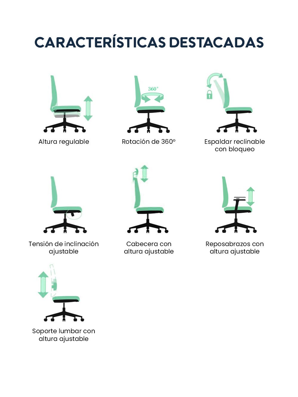 - Funciones: Altura regulable, rotación 360°, cabecera ajustable, espaldar reclinable hasta 120°,reposabrazos y soporte lumbar ajustables