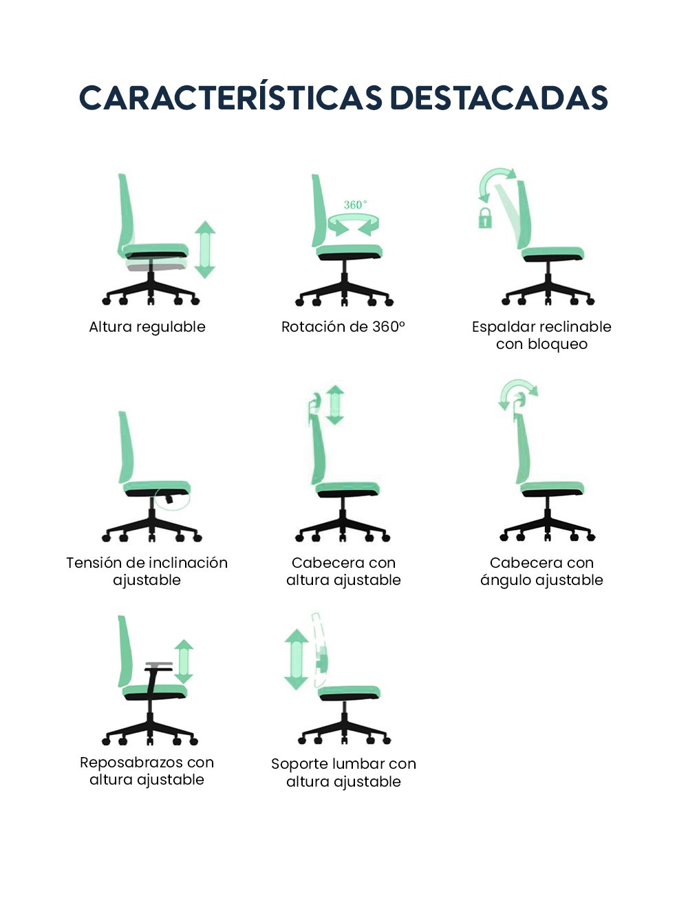 - Funciones ergonómicas: Asiento deslizante, espaldar reclinable y soporte lumbar ajustable