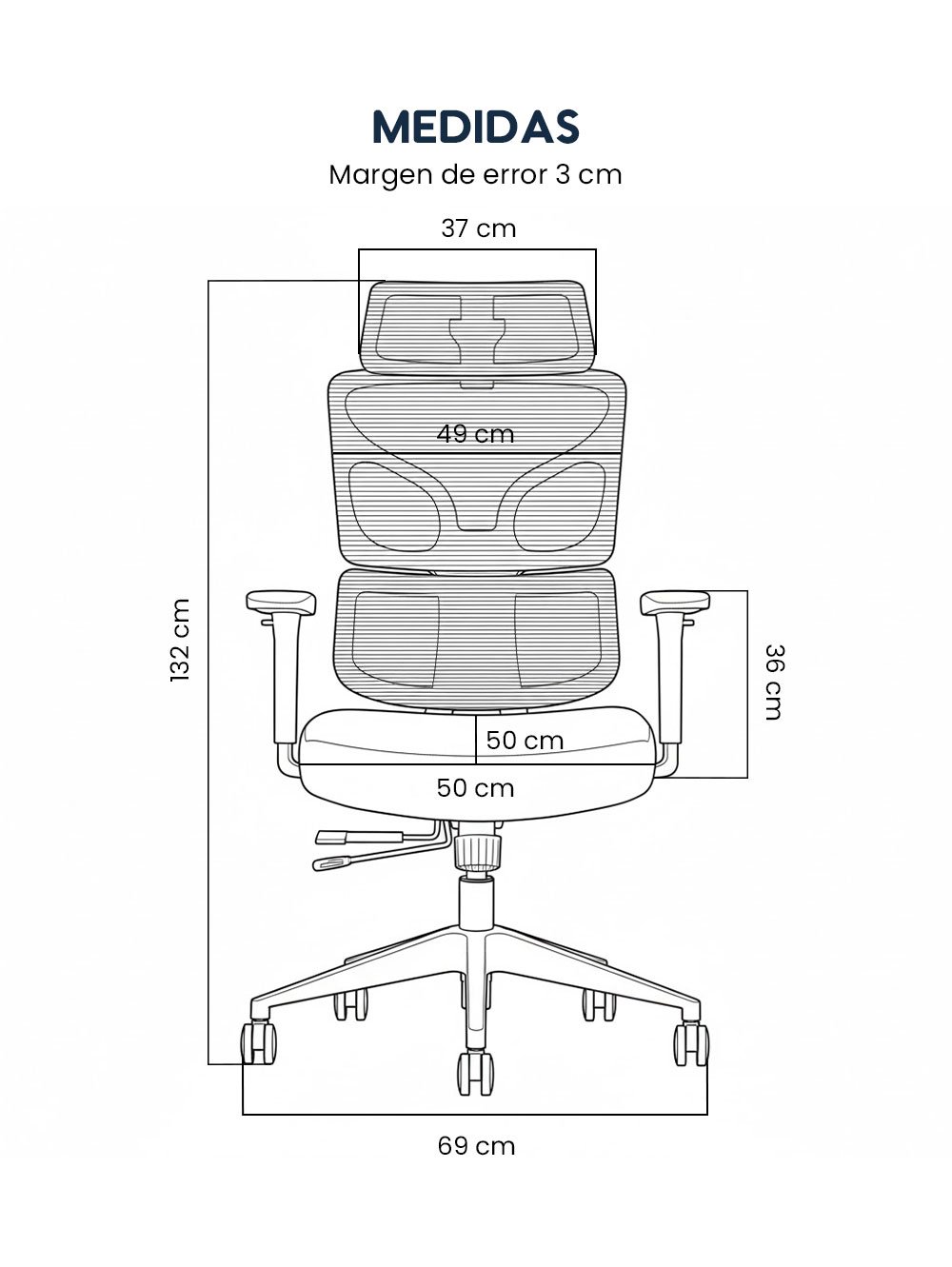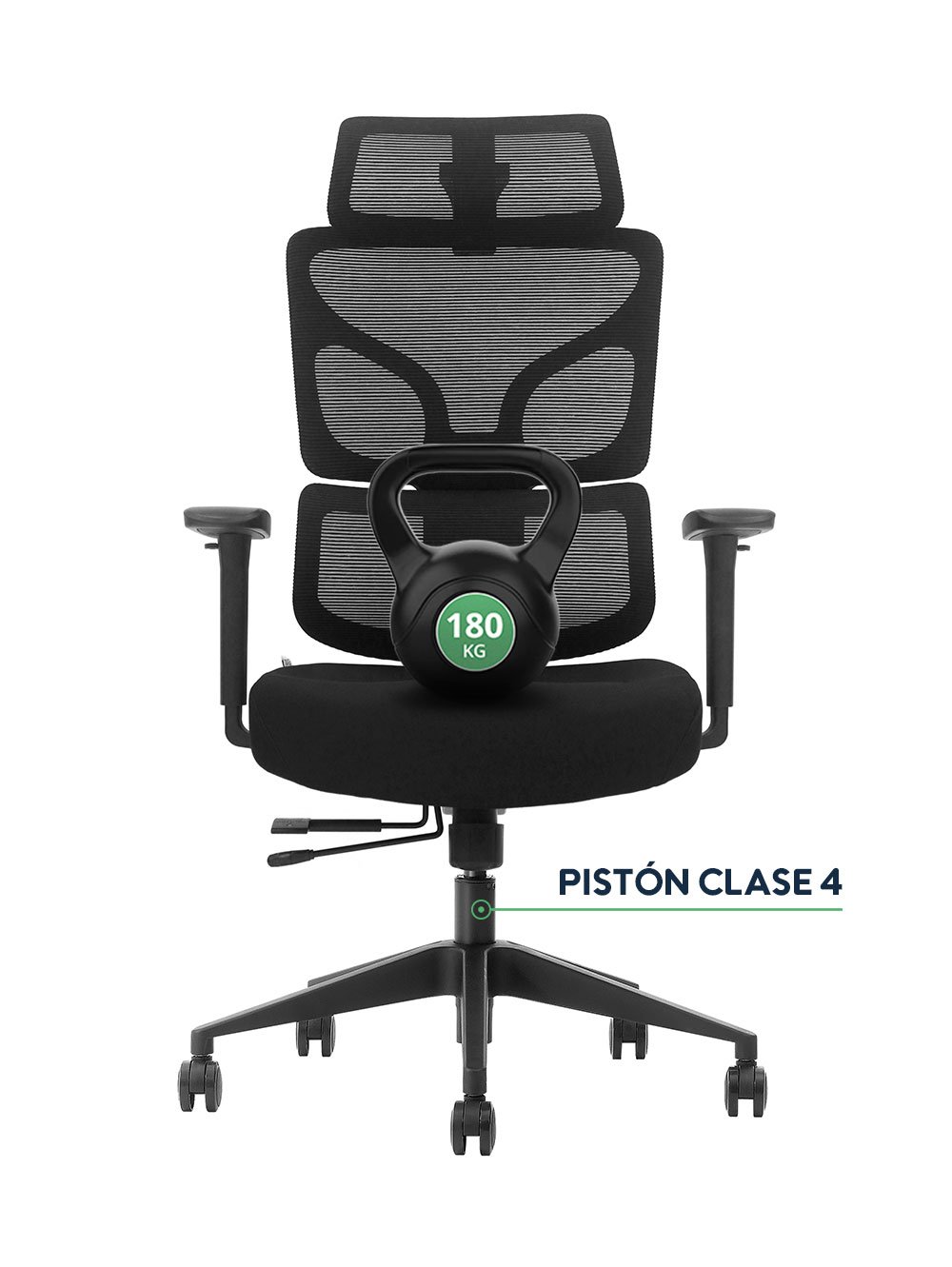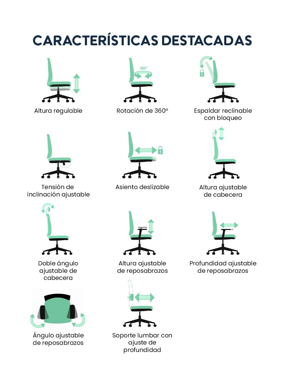 - Funciones: Altura regulable, rotación 360°, cabecera ajustable, asiento deslizante, espaldar reclinable hasta 120°,reposabrazos 3D y soporte lumbar ajustable